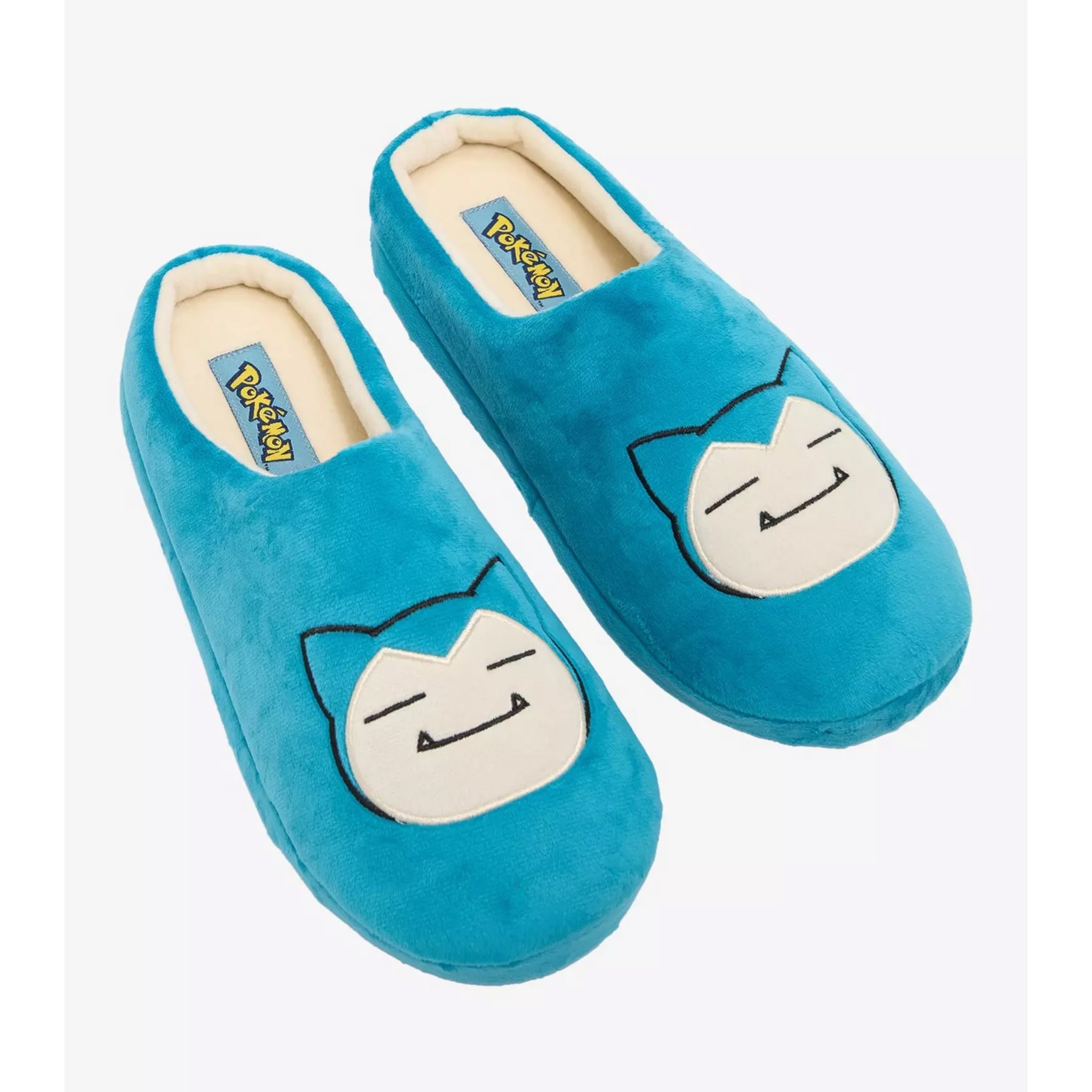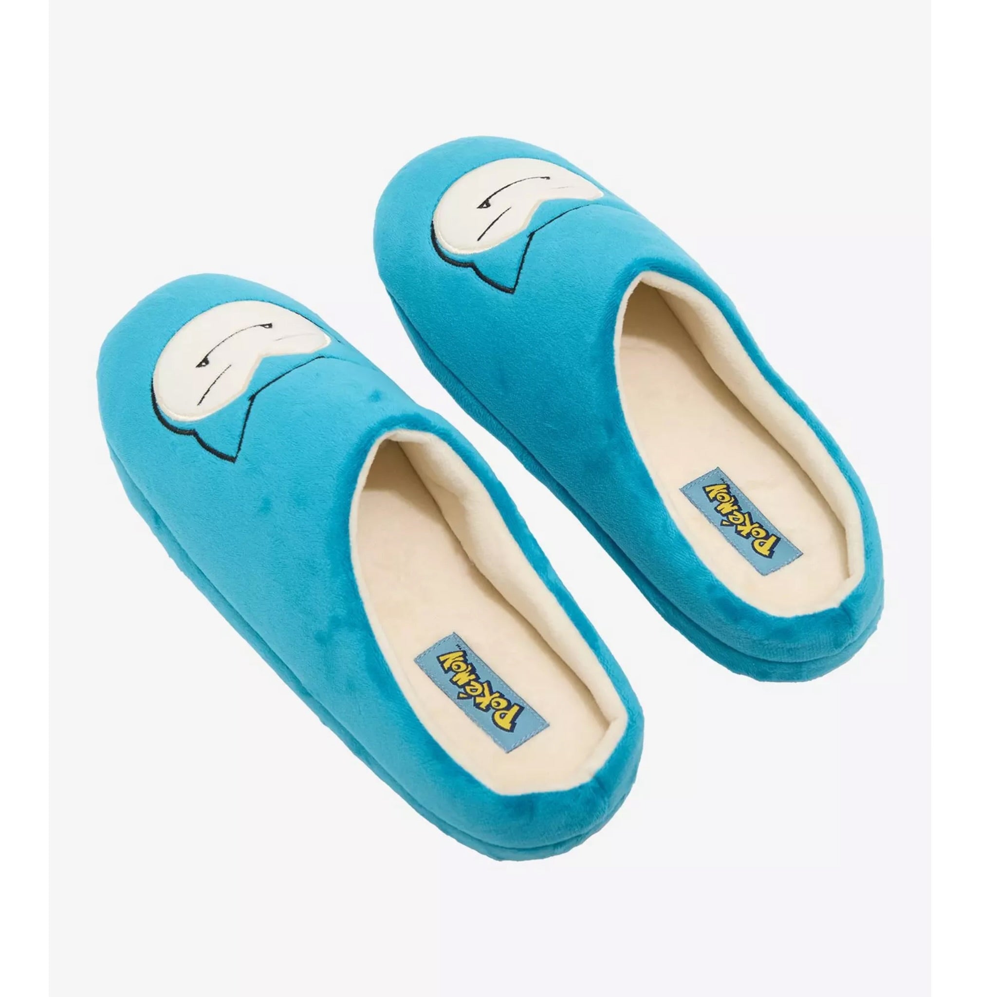 Increíbles pantuflas de Pokémon lucen un estampado con detalles bordados y tela azul afelpada de Snorlax .